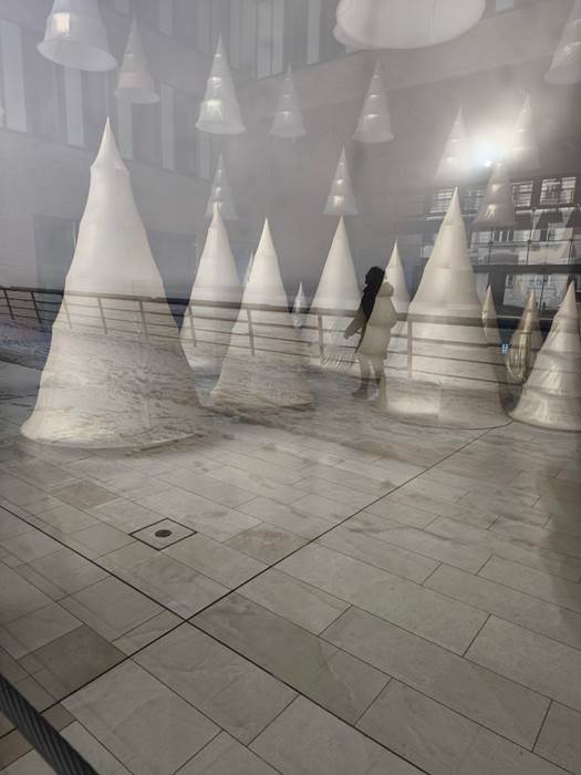 Hinter einer riesigen Glasfassade befindet sich im Inneren des Gebäudes diese Hütcheninstallation – stehend und hängend.